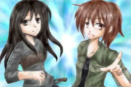 光輝く躍動感ある由利さんと七さん描かれたイラストです。